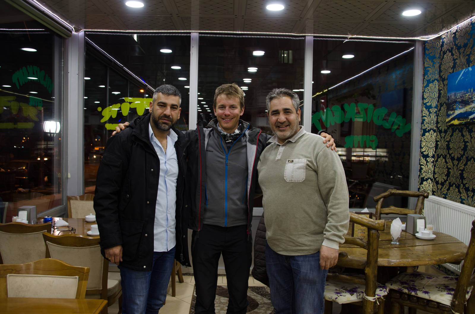 Nachdem ich mal wieder einen Pass überquert habe und es rassig abwärts ging, hatte ich plötzlich ein Auto an meiner Seite, das mich einfach nicht überholen wollte. Stattdessen wurde die Scheibe heruntergekurbelt und noch während der Fahrt begann eine Konversation auf Deutsch. Ob ich wisse, dass ich mich gerade auf 2400 Metern befinde? Die deutsche Familie mit türkischen Wurzeln fand mein Vorhaben echt der Hammer und wollte mich in Erzurum, der nächsten Stadt, nochmals treffen. So wurde Telefonnummer und Adresse ausgetauscht. Als ich dann nach einigem Herumfragen das Haus gefunden hatte und an der Tür klingelte, musste ich erstmals etwas Geduld üben. Dann hiess es, dass die Familie noch einige Besorgungen in der Stadt erledigte. Ich hab mich schon gefragt, ob der Umweg umsonst war, als mich Mikail, der auch zur Familie gehört, in ein Restaurant einlud. Daraus wurden ein echt interessanter Abend, an dem wir über verschiedenste Fragen über die Türkei und das Leben an sich philosophierten.